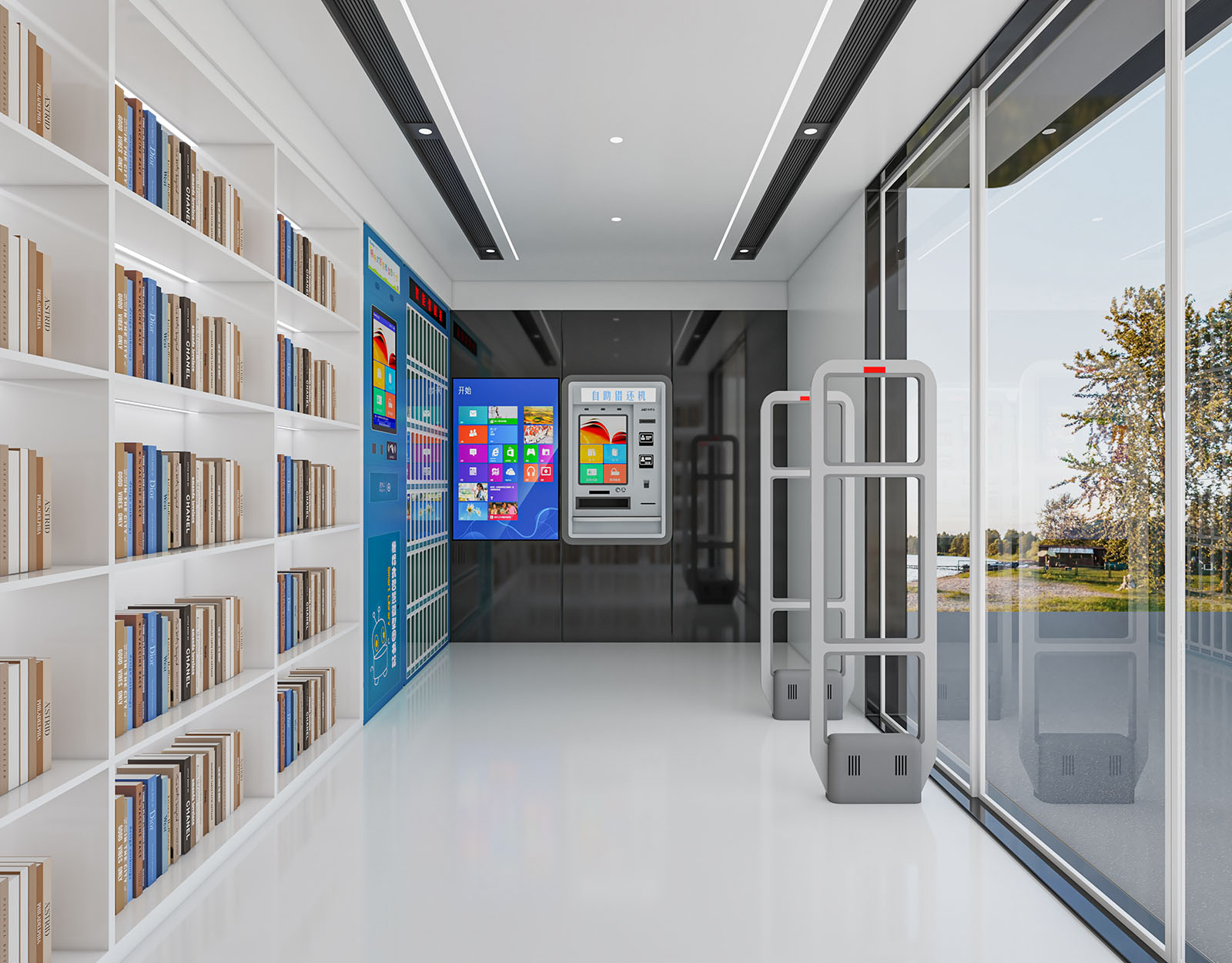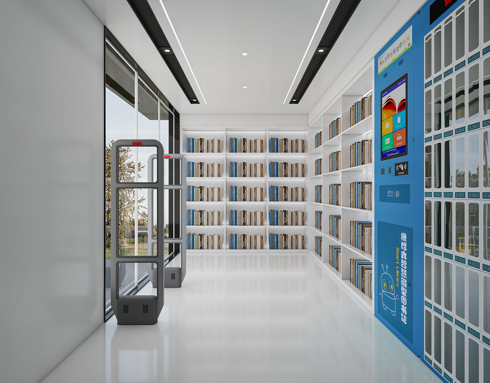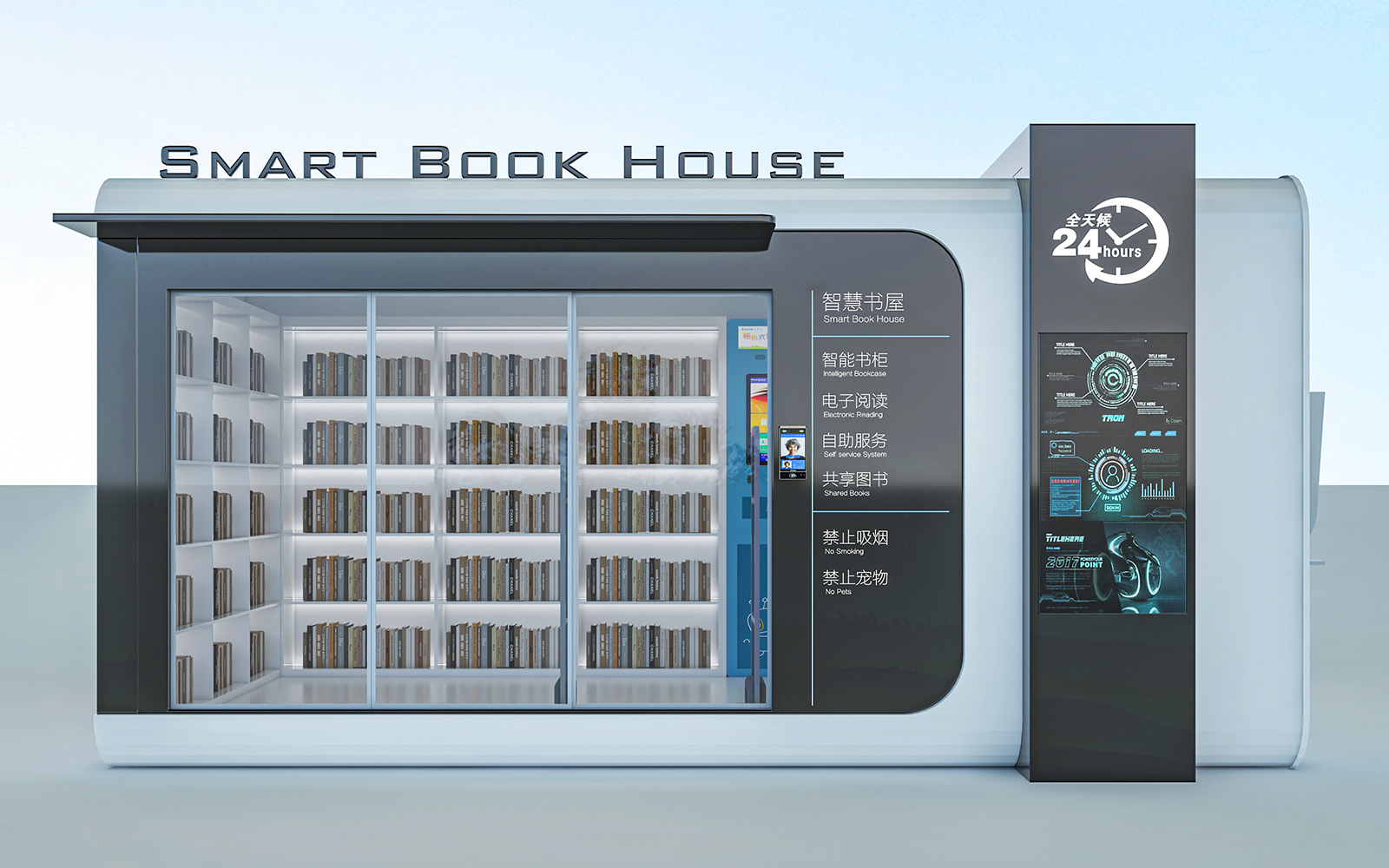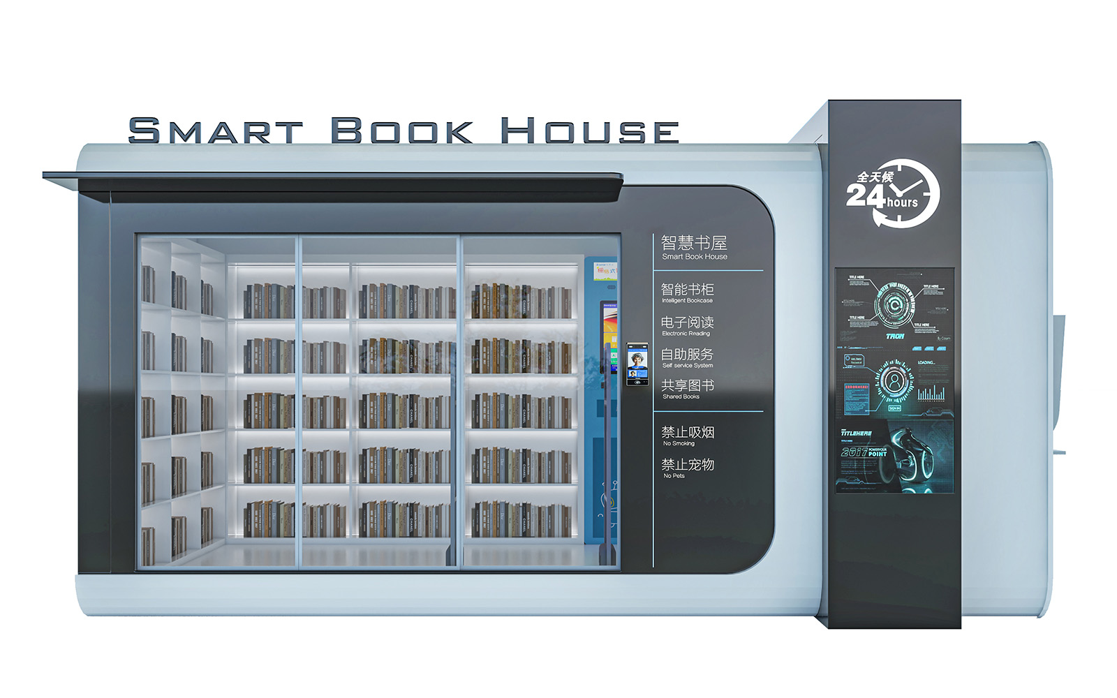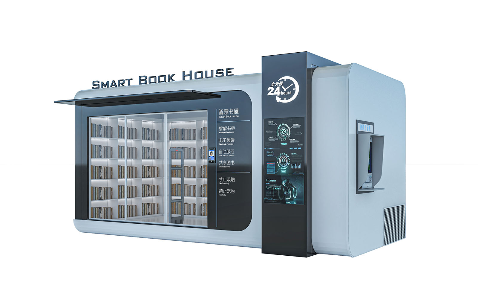 建筑功能:智慧书屋 智能书柜 电子阅读 自助服务 共享图书 禁止吸烟 禁止宠物